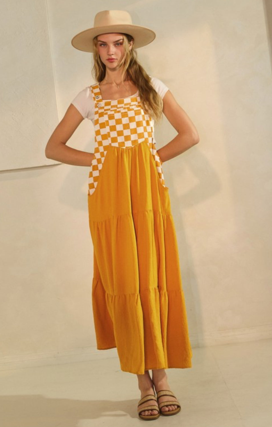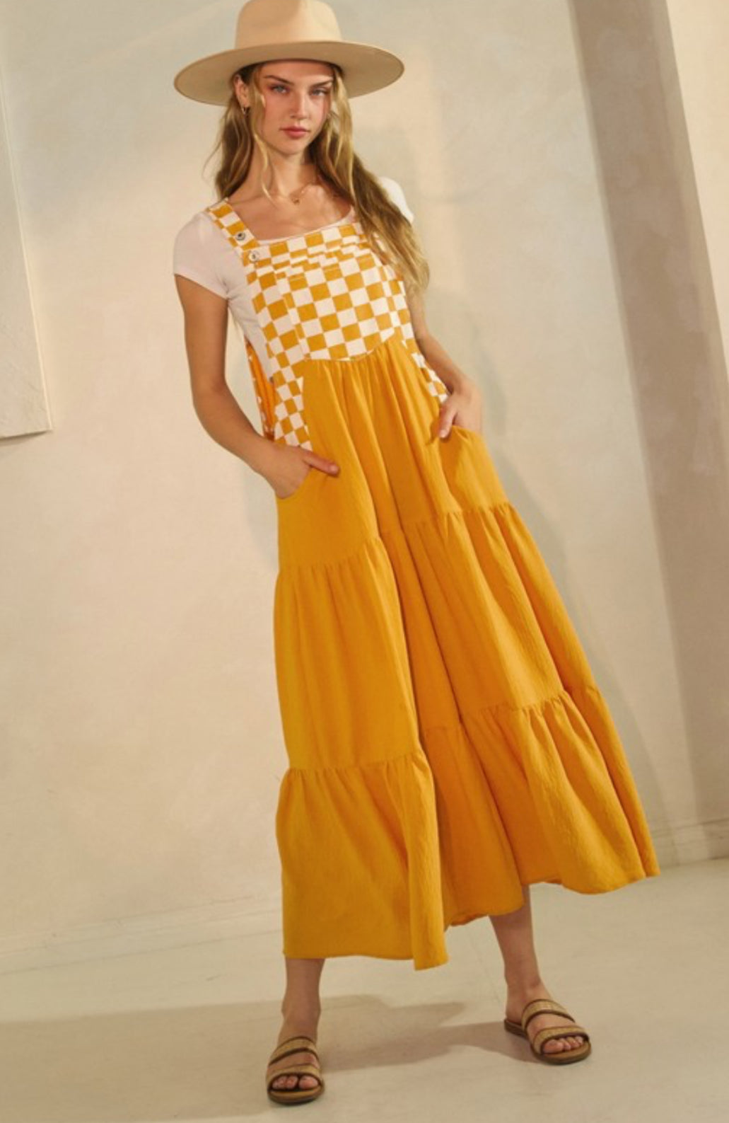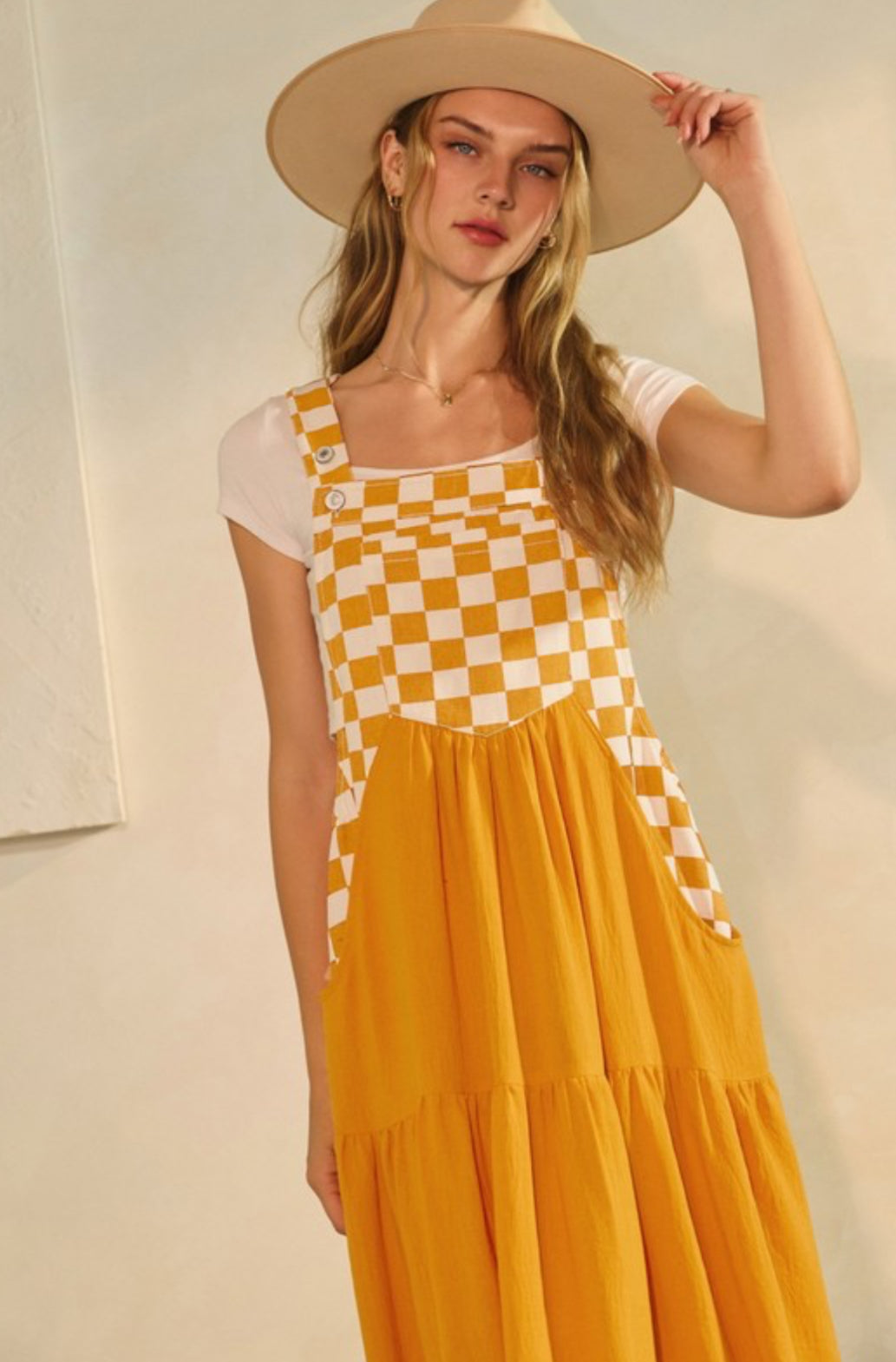 Checkerboard tiered overall dress with a contrast gathered skirt and front patch pockets.