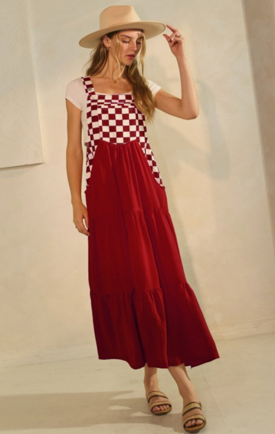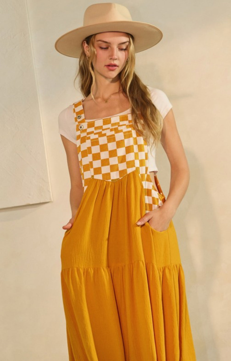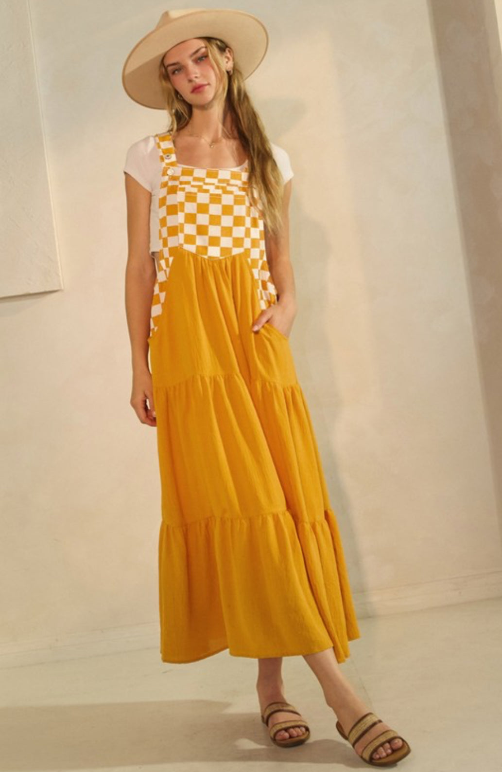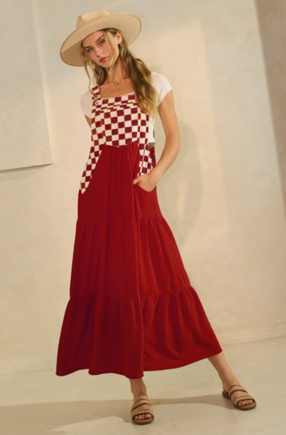 Checkerboard tiered overall dress with a contrast gathered skirt and front patch pockets.