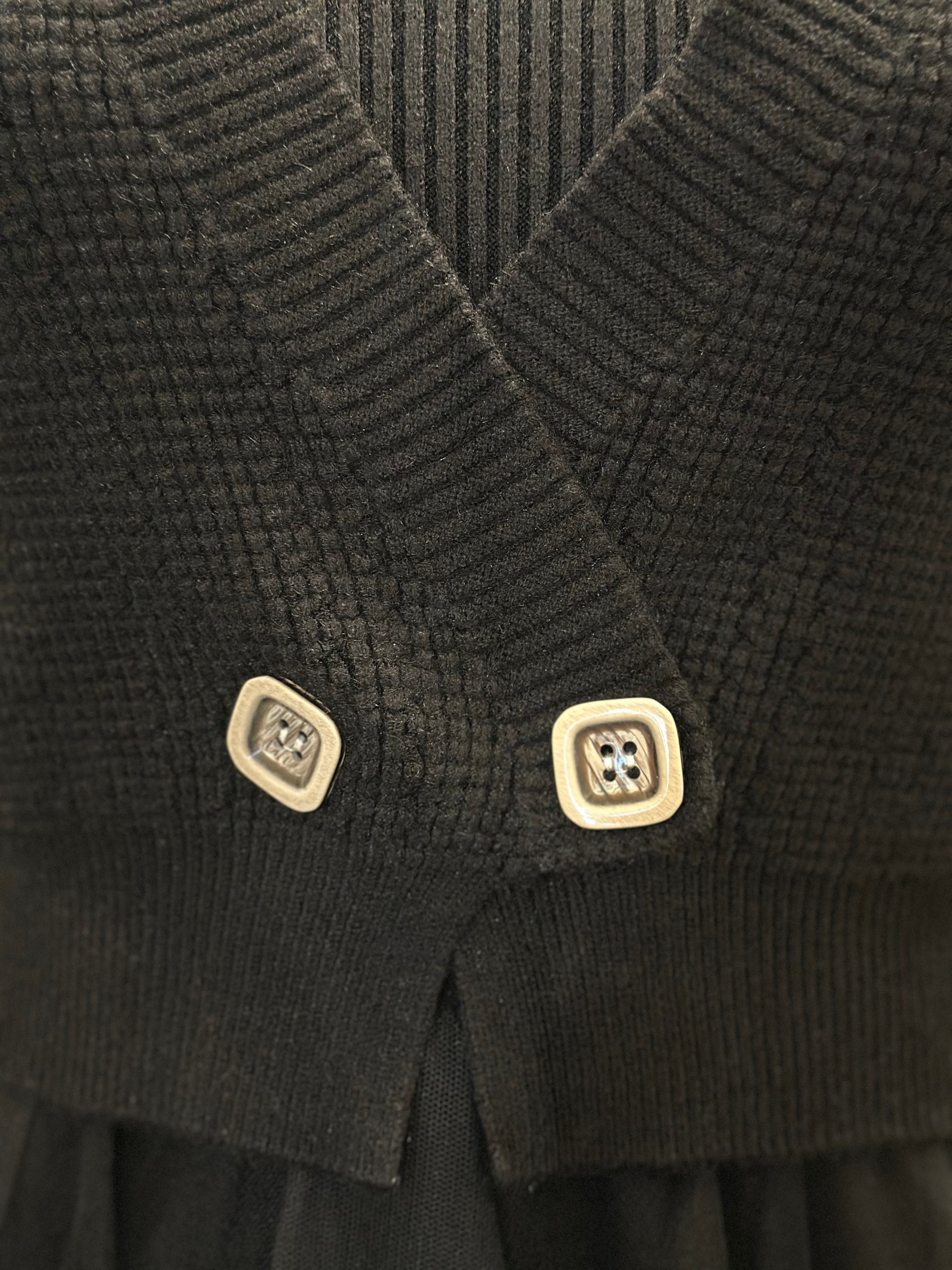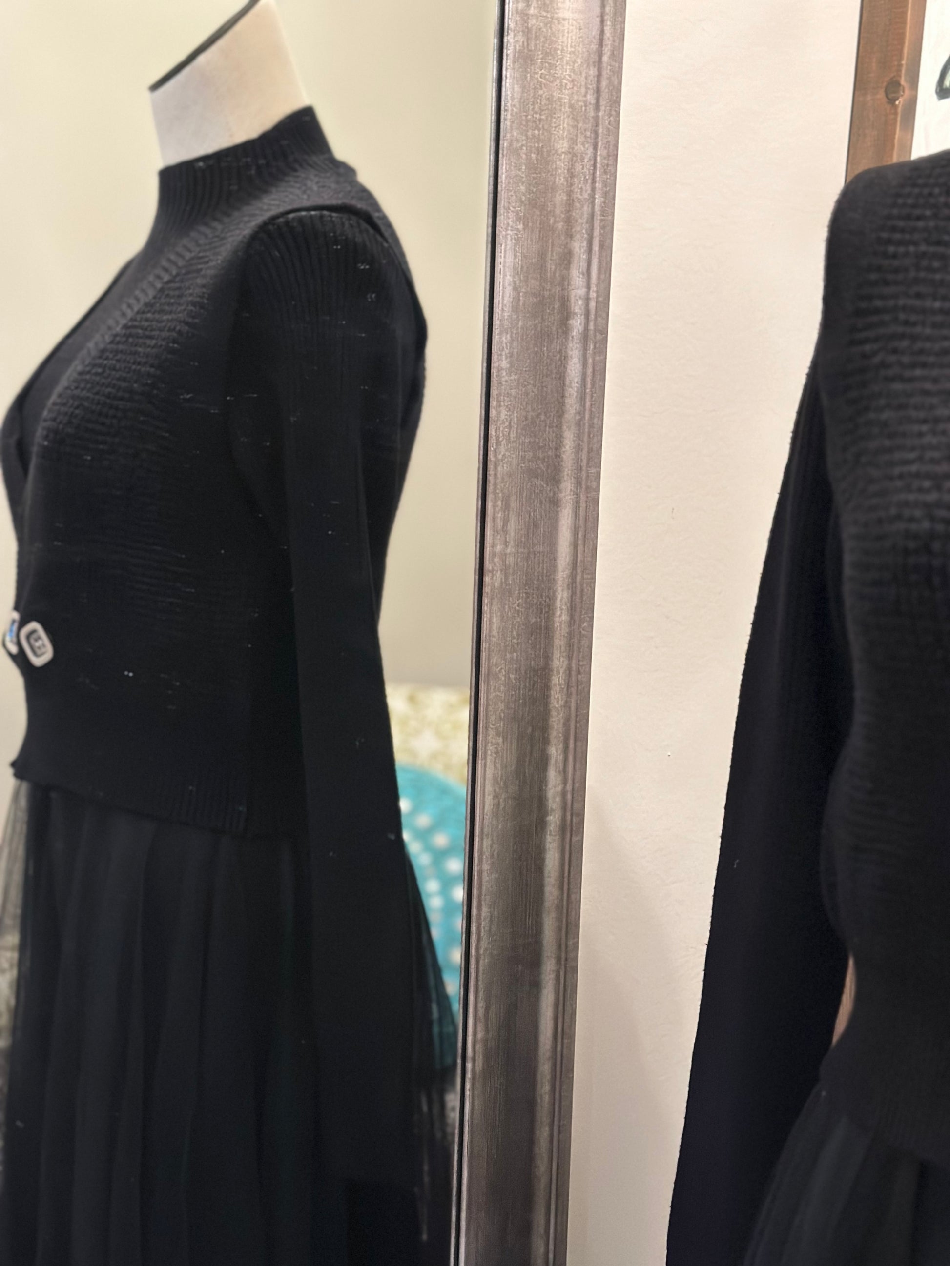 Long sleeve ribbed knit bodice and sleeves with knit Botton and attached Tulle Skirt.